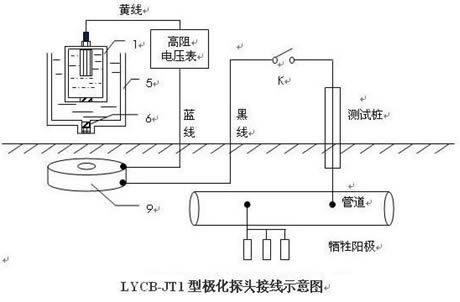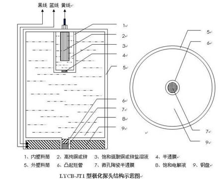 Ⅱ、通过盐桥孔 6 由筒 1 内置的铜/硫酸铜或锌参比电极就可以很容易地用高阻电压表测出钢盘(也是地埋管道)的极化电位。由于盐桥孔 6 的管壁很薄,半透膜微孔陶瓷与钢盘距离很近则由此引起的 IR 降极小,在工程上完全可以忽略不计,即所测出的电极电位就是管道上真实的极化电位。在电化学实验室为了准确测量电极电位,通常要使用一支带有鲁金毛细管的盐桥,以期使参比电极尽量靠近研究电极,从而消除 IR 降使电位测量尽可能真实。同样 LYCB-JT1 极化探头其盐桥孔 6 与钢盘 9 之间的距离(塑料管壁)也很小,仅为数毫米。实际就是工程上的“鲁金毛细管”,从而使 LYCB-JT1 极化探头能有效地抑制 IR 降。